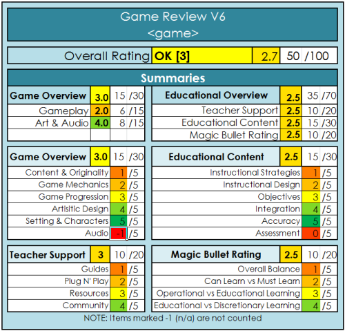 In each of these categories the rating is determined by how well the balance of the elements fits the type of game it is, its intended use and audience.