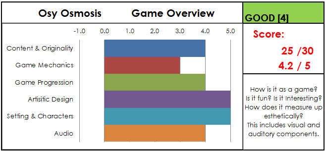 However, players are unlikely to discover any the principles of osmosis from this game. The design is relatively sound, in that the behaviour of the game fits the principles of osmosis. There even seem to be different densities of liquids - I say “seem” because I am extrapolating based seeing slightly different coloured clouds and the fact that the speed with which Osy grows and shrinks changes depending on whether she is over dark background or one of the lighter clouds. The problem is that this connection is never made explicit so this discovery effectively works backwards: if you already know about osmosis, you will probably be able to figure out what the various game elements represent. Unfortunately, if the player does NOT already know these things, the behaviour of the game elements is unlikely to lead them to these insights.