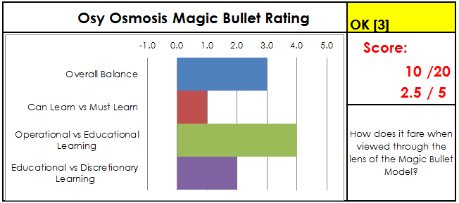 This section examines the game through the lens of the Magic Bullet model to see how well the various learning elements are balanced. This looks at both the overall balance and the educational components