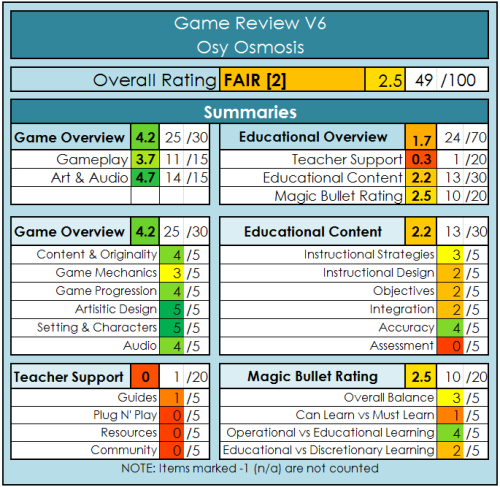 In each of these categories the rating is determined by how well the balance of the elements fits the type of game it is, its intended use and audience.