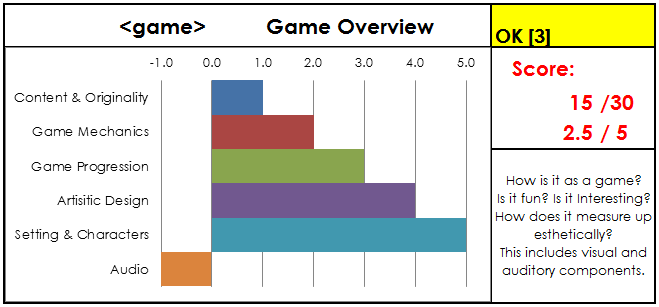 In each of these categories the rating is determined by how well the balance of the elements fits the type of game it is, its intended use and audience.